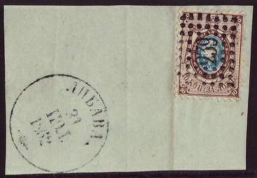 | Keywords: Latvia Forerunner RuNo05 1862 Libau B002a.jpg Philatelic forerunner of Latvia; piece of cover with Latvia forerunner stamp from 1862;<br /> Stamp Russia definitive stamp from 1858; Michel No 5; Yvert Tellier No 5<br /> Color blue / brown<br /> Watermark none<br /> Nominal value 10 Kopeks<br /> Sender postmark Russian chest dotted postmark of the postal district 239 postal district Libawa Libau <br /> Postmark of transition or receiver post office Libawa other date 1862-07-31 Libau contemporary Liepāja Latvia scan of original other date 1862-07-31 date of postmark Postal administration of the Russian Empire PD-LV-exempt PD-RU-exempt stamps <gallery> File Russia 1858 Sc8u JPG The same stamp Russia No 5 from an other location </gallery> Philately Coats of Arms of the Russian Empire with Crown and Coronets Michel Russia No 5; Yvert Tellier Russia No 5 other date 1858-09-19 Postal administration of the Russian Empire lithographic prining 60 000 000 line perforation L 12 12½ Russland Nr 5 Stamps of Latvia Stamps of Russia 1858 Liepāja on stamps Postmarks of Latvia |