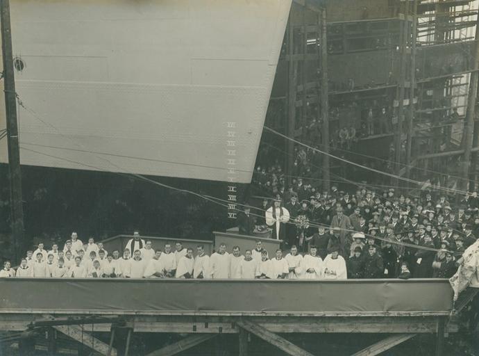 | Keywords: ww1 hawthorn leslie hawthornleslie shipbuilding hebburn hms calypso hmscalypso royal navy royalnavy ship launches shiplaunches light cruiser lightcruiser first world war firstworldwar second world war secondworldwar second battle of heligoland bight secondbattleofheligolandbight shipyard workers shipyardworkers industrial heritage industrialheritage cloth crease boys men maritime heritage maritimeheritage shipbuilding heritage shipbuildingheritage black and white photograph blackandwhitephotograph digital image digitalimage hawthorn leslie warships hawthornlesliewarships archives abstract launch party launchparty gathering event hebburn shipyard hebburnshipyard 24 january 1917 24january1917 rope platform structure production construction sinking june 1940 june1940 italian submarine italiansubmarine 17 november 1917 17november1917 warship vessel majestic impressive fascinating interesting unusual north east of england northeastofengland united kingdom unitedkingdom seated standing cap decoration fence post timber barrier flowers women coat button roman numerals romannumerals measurement wartime black and white Launch party of the light cruiser HMS Calypso, launched at the Hebburn shipyard of Hawthorn Leslie, 24 January 1917 (TWAM ref. 4923/2). HMS Calypso was damaged during the 2nd Battle of Heligoland Bight on 17 November 1917. Calypso went on to serve during the Second World War and tragically was sunk by an Italian submarine in June 1940. The shipyard of R. & W. Hawthorn Leslie at Hebburn built many fine warships. During the First World War the firm built 2 light cruisers, 3 destroyer leaders and 25 torpedo boat destroyers. The firm also built machinery and boilers for 2 battleships, and a further 3 light cruisers. These and other warships built by Hawthorn Leslie before the War, are remembered in this set. There are remarkable images of warships under construction at Hebburn, as well as fascinating shots of the people who attended the launches. The set also contains majestic views of the ships at sea. The images are not only a testimony to the skill of those who designed and built these ships but also to the courage of those who sailed in them. (Copyright) We're happy for you to share these digital images within the spirit of The Commons. Please cite 'Tyne & Wear Archives & Museums' when reusing. Certain restrictions on high quality reproductions and commercial use of the original physical version apply though; if you're unsure please email archives@twmuseums.org.uk Launch party of the light cruiser HMS Calypso, launched at the Hebburn shipyard of Hawthorn Leslie, 24 January 1917 (TWAM ref. 4923/2). HMS Calypso was damaged during the 2nd Battle of Heligoland Bight on 17 November 1917. Calypso went on to serve during the Second World War and tragically was sunk by an Italian submarine in June 1940. The shipyard of R. & W. Hawthorn Leslie at Hebburn built many fine warships. During the First World War the firm built 2 light cruisers, 3 destroyer leaders and 25 torpedo boat destroyers. The firm also built machinery and boilers for 2 battleships, and a further 3 light cruisers. These and other warships built by Hawthorn Leslie before the War, are remembered in this set. There are remarkable images of warships under construction at Hebburn, as well as fascinating shots of the people who attended the launches. The set also contains majestic views of the ships at sea. The images are not only a testimony to the skill of those who designed and built these ships but also to the courage of those who sailed in them. (Copyright) We're happy for you to share these digital images within the spirit of The Commons. Please cite 'Tyne & Wear Archives & Museums' when reusing. Certain restrictions on high quality reproductions and commercial use of the original physical version apply though; if you're unsure please email archives@twmuseums.org.uk |