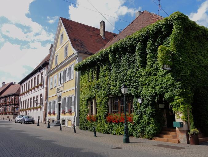 Keywords: lauterbourg france town buildings architecture sky clouds plants flowers ivy vines growth outside street