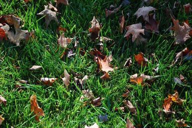 Keywords: lawn green turf grass fall seasonal sunny day leaves ground yearly cycle