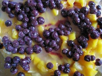 Keywords: layer fruit peaches yellow berries purple pieces trifle