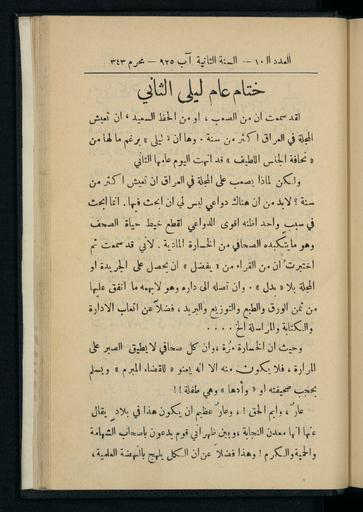 | Keywords: Layla, Issue 10, August 1925 WDL3033.jpg Artwork ru Хассун Паулина fr Hassoun Paulina en Hassoun Paulina zh 哈桑 琳 pt Hassoun Paulina ar حسون بولينا es Hassoun Paulina ru Лейла выпуск 10 август 1925 г fr Layla numéro 10 août 1925 en Layla Issue 10 August 1925 zh Layla ,第 10 ,1925 年 8 pt Layla Edição 10 agosto de 1925 ar ليلى، العدد 10، آب 1925 ru <i> Лейла </i> был пе вым женским жу налом опубликованным в И аке Этот жу нал впе вые выпущенный в 1923 году был посвящен новейшим полезным воп осам связанным с наукой искусством лите ату ой социологией и в частности воспитанию и обучению девочек здо овью семьи и д угим воп осам касающимся ведения домашнего хозяйства После установления национального п авительства в И аке появилось несколько жу налов и газет посвященных женским воп осам <i> Лейла </i>ознаменовал собой за ождение женской п ессы в И аке этот жу нал считается одним из факто ов повлиявших на возникновение и фо ми ование а абского женского движения Жу нал выпускался под девизом а пути к воз ождению и акской женщины и асп ост анял новости культу ы об азования и воп осов касающихся семьи а также возглавлял кампанию за освобождение женщин В числе его азделов были следующие Испытание п авом алоговые новости Уголок домохозяйки Забавные новости Кольца магических ст ок и д угие В жу нале также освещались воп осы касающиеся исследований в области медицины лите ату ы и поэзии и были опубликованы п оизведения известных и акских поэтов аль-Расафи и аль-Захави Одной из наиболее значимых статей опубликованных в жу нале была статья вышедшая в Выпуске 6 от 15 мая 1924 года об ащенная к Уч едительному соб анию И ака с п изывом п едоставить женщинам их законные п ава Всего было выпущено <i> </i>20 выпусков жу нала Лейла В последнем выпуске от 15 августа 1925 года соде жалась печальная статья в кото ой читателям жу нала объяснялось сложное финансовое положение жу нала Вско е после этого владелица жу нала Паулина Хассун покинула И ак и жу нал п ек атил свое существование <br>Жу налы для женщин fr <i>Layla</i> a été le premier magazine féminin publié en Irak Lancée en 1923 la revue traitait de sujets nouveaux et utiles dans des domaines aussi variés que la science l'art la littérature la sociologie mais aussi l'éducation des enfants et des jeunes filles la santé familiale et d'autres sujets relevant de l'économie domestique L'établissement d'un régime républicain en Irak a été suivi par l'apparition de plusieurs journaux et magazines traitant de problématiques féminines <i> Layla </i>a marqué les débuts de la presse féminine en Irak et le magazine est considéré comme un des facteurs de l'émergence du mouvement des femmes arabes Publié sous le bandeau Sur la voie de la renaissance de la femme irakienne le magazine diffusait des informations à propos de culture d'éducation et de la famille et a également pris la tête d'une campagne de libération de la femme Ses éditoriaux avaient pour titre Le creuset du Droit Actualités fiscales Le coin des femmes au foyer Informations insolites Anneaux de cordes magiques etc Le magazine s'intéressait également à la recherche médicale à la littérature et à la poésie et a publié des oeuvres des célèbres poètes irakiens al-Rasafi et al-Zahawi L'un des plus importants articles parus dans le magazine a été l'éditorial du numéro 6 datant du 15 mai 1924 adressé à l'Assemblée constituante irakienne et lui demandant d'accorder leurs droits aux femmes Layla<i> </i>n'a connu que 20 parutions Son dernier numéro daté du 15 août 1925 comprend un article au ton triste expliquant aux lecteurs la situation financière difficile du magazine Peu de temps après la propriétaire Paulina Hassoun a quitté l'Irak et la revue a cessé de paraître <br>Périodiques féminins en <i>Layla</i> was the first women's magazine to be published in Iraq Launched in 1923 the magazine dealt with new and useful matters related to science art literature sociology and in particular to child-rearing and the education of girls family health and other matters pertaining to home economics The establishment of national rule in Iraq was followed by the emergence of several magazines and newspapers dealing with women's issues <i>Layla</i> marked the beginnings of the women's press in Iraq and the magazine is credited with being one of the factors in the emergence of the Arab women s movement Published under the banner On the Way to Revival of the Iraqi Woman the magazine disseminated news about culture education and family affairs as well as led a campaign for the liberation of w