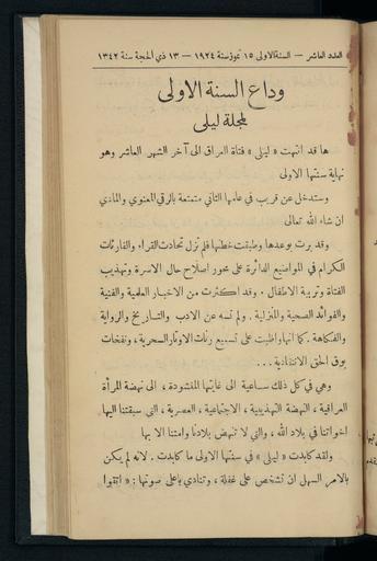 | Keywords: Layla, Issue 10, July 15, 1924 WDL2858.jpg Artwork ru Хассун Паулина fr Hassoun Paulina en Hassoun Paulina zh 哈桑 琳 pt Hassoun Paulina ar حسون بولينا es Hassoun Paulina ru Лейла выпуск 10 15 июля 1924 г fr Layla numéro 10 15 juillet 1924 en Layla Issue 10 July 15 1924 zh Layla ,第 10 ,1924 年 7 15 日 pt Layla Edição 10 15 de julho de 1924 ar ليلى، العدد 10، 15 تموز 1924 ru <i> Лейла </i> был пе вым женским жу налом опубликованным в И аке Этот жу нал впе вые выпущенный в 1923 году был посвящен новейшим полезным воп осам связанным с наукой искусством лите ату ой социологией и в частности воспитанию и обучению девочек здо овью семьи и д угим воп осам касающимся ведения домашнего хозяйства После установления национального п авительства в И аке появилось несколько жу налов и газет посвященных женским воп осам <i> Лейла </i>ознаменовал собой за ождение женской п ессы в И аке этот жу нал считается одним из факто ов повлиявших на возникновение и фо ми ование а абского женского движения Жу нал выпускался под девизом а пути к воз ождению и акской женщины и асп ост анял новости культу ы об азования и воп осов касающихся семьи а также возглавлял кампанию за освобождение женщин В числе его азделов были следующие Испытание п авом алоговые новости Уголок домохозяйки Забавные новости Кольца магических ст ок и д угие В жу нале также освещались воп осы касающиеся исследований в области медицины лите ату ы и поэзии и были опубликованы п оизведения известных и акских поэтов аль-Расафи и аль-Захави Одной из наиболее значимых статей опубликованных в жу нале была статья вышедшая в Выпуске 6 от 15 мая 1924 года об ащенная к Уч едительному соб анию И ака с п изывом п едоставить женщинам их законные п ава Всего было выпущено <i> </i>20 выпусков жу нала Лейла В последнем выпуске от 15 августа 1925 года соде жалась печальная статья в кото ой читателям жу нала объяснялось сложное финансовое положение жу нала Вско е после этого владелица жу нала Паулина Хассун покинула И ак и жу нал п ек атил свое существование <br>Жу налы для женщин fr <i>Layla</i> a été le premier magazine féminin publié en Irak Lancée en 1923 la revue traitait de sujets nouveaux et utiles dans des domaines aussi variés que la science l'art la littérature la sociologie mais aussi l'éducation des enfants et des jeunes filles la santé familiale et d'autres sujets relevant de l'économie domestique L'établissement d'un régime républicain en Irak a été suivi par l'apparition de plusieurs journaux et magazines traitant de problématiques féminines <i> Layla </i>a marqué les débuts de la presse féminine en Irak et le magazine est considéré comme un des facteurs de l'émergence du mouvement des femmes arabes Publié sous le bandeau Sur la voie de la renaissance de la femme irakienne le magazine diffusait des informations à propos de culture d'éducation et de la famille et a également pris la tête d'une campagne de libération de la femme Ses éditoriaux avaient pour titre Le creuset du Droit Actualités fiscales Le coin des femmes au foyer Informations insolites Anneaux de cordes magiques etc Le magazine s'intéressait également à la recherche médicale à la littérature et à la poésie et a publié des oeuvres des célèbres poètes irakiens al-Rasafi et al-Zahawi L'un des plus importants articles parus dans le magazine a été l'éditorial du numéro 6 datant du 15 mai 1924 adressé à l'Assemblée constituante irakienne et lui demandant d'accorder leurs droits aux femmes Layla<i> </i>n'a connu que 20 parutions Son dernier numéro daté du 15 août 1925 comprend un article au ton triste expliquant aux lecteurs la situation financière difficile du magazine Peu de temps après la propriétaire Paulina Hassoun a quitté l'Irak et la revue a cessé de paraître <br>Périodiques féminins en <i>Layla</i> was the first women's magazine to be published in Iraq Launched in 1923 the magazine dealt with new and useful matters related to science art literature sociology and in particular to child-rearing and the education of girls family health and other matters pertaining to home economics The establishment of national rule in Iraq was followed by the emergence of several magazines and newspapers dealing with women's issues <i>Layla</i> marked the beginnings of the women's press in Iraq and the magazine is credited with being one of the factors in the emergence of the Arab women s movement Published under the banner On the Way to Revival of the Iraqi Woman the magazine disseminated news about culture education and family affairs as well as led a campai