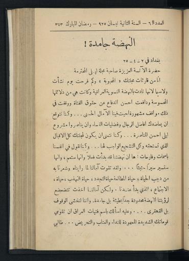 | Keywords: Layla, Issue 6, April 1925 WDL2866.jpg Artwork ru Хассун Паулина fr Hassoun Paulina en Hassoun Paulina zh 哈桑 琳 pt Hassoun Paulina ar حسون بولينا es Hassoun Paulina ru Лейла выпуск 6 ап ель 1925 г fr Layla numéro 6 avril 1925 en Layla Issue 6 April 1925 zh Layla ,第 6 ,1925 年 4 pt Layla Edição 6 abril de 1925 ar ليلى، العدد 6، نيسان 1925 ru <i> Лейла </i> был пе вым женским жу налом опубликованным в И аке Этот жу нал впе вые выпущенный в 1923 году был посвящен новейшим полезным воп осам связанным с наукой искусством лите ату ой социологией и в частности воспитанию и обучению девочек здо овью семьи и д угим воп осам касающимся ведения домашнего хозяйства После установления национального п авительства в И аке появилось несколько жу налов и газет посвященных женским воп осам <i> Лейла </i>ознаменовал собой за ождение женской п ессы в И аке этот жу нал считается одним из факто ов повлиявших на возникновение и фо ми ование а абского женского движения Жу нал выпускался под девизом а пути к воз ождению и акской женщины и асп ост анял новости культу ы об азования и воп осов касающихся семьи а также возглавлял кампанию за освобождение женщин В числе его азделов были следующие Испытание п авом алоговые новости Уголок домохозяйки Забавные новости Кольца магических ст ок и д угие В жу нале также освещались воп осы касающиеся исследований в области медицины лите ату ы и поэзии и были опубликованы п оизведения известных и акских поэтов аль-Расафи и аль-Захави Одной из наиболее значимых статей опубликованных в жу нале была статья вышедшая в Выпуске 6 от 15 мая 1924 года об ащенная к Уч едительному соб анию И ака с п изывом п едоставить женщинам их законные п ава Всего было выпущено <i> </i>20 выпусков жу нала Лейла В последнем выпуске от 15 августа 1925 года соде жалась печальная статья в кото ой читателям жу нала объяснялось сложное финансовое положение жу нала Вско е после этого владелица жу нала Паулина Хассун покинула И ак и жу нал п ек атил свое существование <br>Жу налы для женщин fr <i>Layla</i> a été le premier magazine féminin publié en Irak Lancée en 1923 la revue traitait de sujets nouveaux et utiles dans des domaines aussi variés que la science l'art la littérature la sociologie mais aussi l'éducation des enfants et des jeunes filles la santé familiale et d'autres sujets relevant de l'économie domestique L'établissement d'un régime républicain en Irak a été suivi par l'apparition de plusieurs journaux et magazines traitant de problématiques féminines <i> Layla </i>a marqué les débuts de la presse féminine en Irak et le magazine est considéré comme un des facteurs de l'émergence du mouvement des femmes arabes Publié sous le bandeau Sur la voie de la renaissance de la femme irakienne le magazine diffusait des informations à propos de culture d'éducation et de la famille et a également pris la tête d'une campagne de libération de la femme Ses éditoriaux avaient pour titre Le creuset du Droit Actualités fiscales Le coin des femmes au foyer Informations insolites Anneaux de cordes magiques etc Le magazine s'intéressait également à la recherche médicale à la littérature et à la poésie et a publié des oeuvres des célèbres poètes irakiens al-Rasafi et al-Zahawi L'un des plus importants articles parus dans le magazine a été l'éditorial du numéro 6 datant du 15 mai 1924 adressé à l'Assemblée constituante irakienne et lui demandant d'accorder leurs droits aux femmes Layla<i> </i>n'a connu que 20 parutions Son dernier numéro daté du 15 août 1925 comprend un article au ton triste expliquant aux lecteurs la situation financière difficile du magazine Peu de temps après la propriétaire Paulina Hassoun a quitté l'Irak et la revue a cessé de paraître <br>Périodiques féminins en <i>Layla</i> was the first women's magazine to be published in Iraq Launched in 1923 the magazine dealt with new and useful matters related to science art literature sociology and in particular to child-rearing and the education of girls family health and other matters pertaining to home economics The establishment of national rule in Iraq was followed by the emergence of several magazines and newspapers dealing with women's issues <i>Layla</i> marked the beginnings of the women's press in Iraq and the magazine is credited with being one of the factors in the emergence of the Arab women s movement Published under the banner On the Way to Revival of the Iraqi Woman the magazine disseminated news about culture education and family affairs as well as led a campaign for the liberation of women 