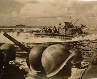 | Keywords: monochrome LC-USZ62-99393: Battle for Angaur Island, Palau Islands, September 17-October 22, 1944. Amphtracs Smash Against the Beach of Angaur. Guns ready, grim-faced Army-Infantrymen sweep toward the beach of Angaur island in the Palaus. This sharp photo of amphibious invasion was made by a Coast Guard Combat Photographer heading toward the beachhead in the first waves. It shows at close range an LVT(A) churning through the surf. Its caterpillar treads enable the landing vehicle tanks armored to creep over the hidden reefs that sometimes block the LCVPs. From Lot 4568. (7/10/2015). LC-USZ62-99393: Battle for Angaur Island, Palau Islands, September 17-October 22, 1944. Amphtracs Smash Against the Beach of Angaur. Guns ready, grim-faced Army-Infantrymen sweep toward the beach of Angaur island in the Palaus. This sharp photo of amphibious invasion was made by a Coast Guard Combat Photographer heading toward the beachhead in the first waves. It shows at close range an LVT(A) churning through the surf. Its caterpillar treads enable the landing vehicle tanks armored to creep over the hidden reefs that sometimes block the LCVPs. From Lot 4568. (7/10/2015). |