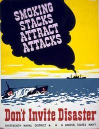 | Keywords: poster text LC-USZC4-5065: World War II Poster. “Smoking Stacks Attract Attacks / Don’t Invite Disaster.” Thirteenth Naval District originated poster shows smoke coming from a smokestack of ship with a Japanese submarine in the foreground. Artwork by Phil Von Phul, probably 1941. (6/19/2015). LC-USZC4-5065: World War II Poster. “Smoking Stacks Attract Attacks / Don’t Invite Disaster.” Thirteenth Naval District originated poster shows smoke coming from a smokestack of ship with a Japanese submarine in the foreground. Artwork by Phil Von Phul, probably 1941. (6/19/2015). |