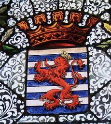 | Keywords: Le Blason sur les vitraux de l hotel de ville Arlon ( Belgium ).png Les vitraux à l'hôtel de ville d'Arlon province de Luxembourg Belgique Les armoiries officielles de la ville d'Arlon fixées par arrêté royal le 24 novembre 1841 sont « burelées d'argent et d'azur au lion de gueules la queue fourchue couronné d'or brochant sur le tout l'écu timbré d'une couronne d'or » Les armoiries sont celles d'Henri le Blond du duché de Luxembourg fils de Waléran III et d'Ermesinde La ville d'Arlon les a adoptées avec comme brisure distinctive la couleur de la langue et des griffes du lion qui sont de gueules au lieu d'être d'or Ce blason est différent du sceau de la ville d'Arlon qui est encore celui utilisé pour les bulletins communaux les sites de la ville et qui date du XVI e siècle avec l'inscription « S Secretum oppidi arlunensis » Bulletin communal d'information “ Ville d'Arlon rue Paul Reuter 8 B-6700 Arlon http //www arlon be/fileadmin/Documents/Telechargements/vivrearlon042005 pdf 2005-04 2009-03-11 update Guy Larcier “ Bourgmestre “ Bulletin Avril 2005 GFDL relicense Symbols of Arlon Buildings in Arlon Arelerland Coats of arms of municipalities of Luxembourg province Arlon |