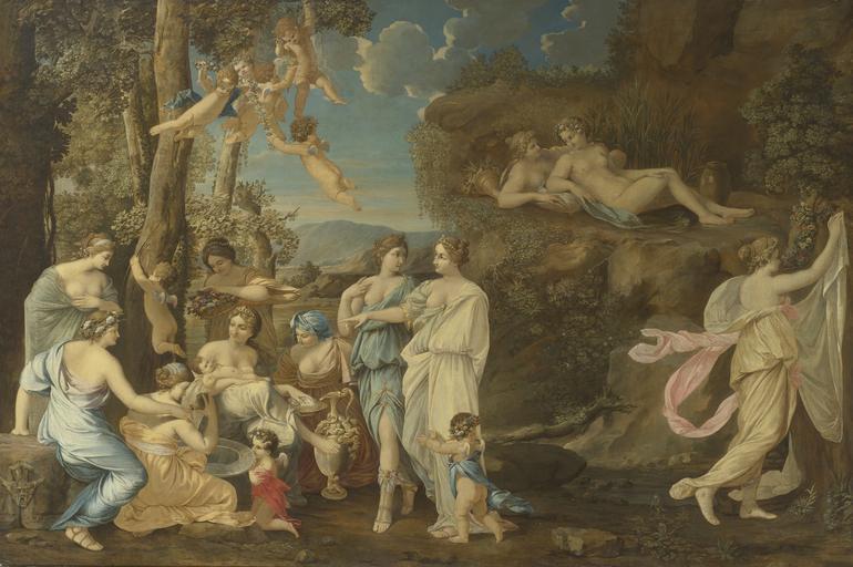| Keywords: Le Maître Hovingham - La naissance de Bacchus.jpg Artwork Creator Master of Hovingham w Nicolas Poussin - other date century 17 early other date century 18 oil canvas cm 144 8 215 8 object history The Hamilton Collection; A Grégoire Collection Paris according to a label and red wax seal on the reverse ; Étienne-François Haro 1827 - 1897 and his son Jules Haro 1855 - 1892 Paris; Their Estate Sale Paris Galerie Sedelmeyer 30-31 May 1892 lot 39 as Nicolas Poussin ;<br/> Private Collection England credit line accession number http //www sothebys com/en/catalogues/ecatalogue html/2012/old-master-paintings-n08869 /r /en/ecat fhtml N08869 html+r m /en/ecat lot N08869 html/58/ Sotheby's PD-Art-100 Master of Hovingham 17th-century mythological paintings Baroque paintings of mythology 18th-century mythological paintings Angels with flowers Mythological paintings of putti Flower baskets in art Female couples in art 18th-century paintings in unidentified private collections 17th-century paintings in unidentified private collections Mythological figures in nature Paintings of people in nature Images from Sotheby's |