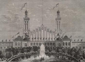 | Keywords: Le palais du Trocadéro, 1878.jpg Palais du Trocadéro during the 1878 Paris World Fair This view is taken from the place du Trocadéro which was not the main facade of the building the main facade was facing the Champ-de-Mars and the World Fair exhibition sites The Trocadéro had been designed specifically for the 1878 fair by the architects Davioud and Bourdais The building had three parts the monumental central rotunda framed by two minaret-like towers served as a reception and concert hall which could contain about 5000 people Two galleries on each side went from the rotunda to the outside of the building and were inspired by St Peter's Piazza in Rome The Palais was eventually damaged by a fire in 1935 and does not exist anymore today 1878 engraving 22 8 x 31 cm Institution Brown University Library object history exhibition history credit line Bitard Adolphe L' Exposition de Paris 1878 Rédigée par A Bitard avec la collaboration d'écrivains spéciaux Paris Librairie illustrée; Librairie M Dreyfous 1878 accession number 1254166073516465 PD-old Engravings of Paris Images of Paris from the Brown University Library Palais du Trocadéro Exposition Universelle 1878 |