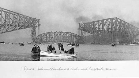 | Keywords: Le pont de Quebec avant l ecroulement de l arche centrale le 11 septembre 1916.jpg fr Pont de Québec 11 septembre 1916<br> « Le 11 septembre 1916 s ™annonce un jour de fête à Québec puisque ce jour-là on va procéder à l ™installation de la travée centrale du pont de Québec Construite dans l ™anse de Sillery cette travée réunit les deux bras cantilever et représente la fin de la construction du pont Plus de 100 000 personnes sont au rendez-vous à Québec pour ne rien manquer de cette opération que l ™on réalise pour la première fois dans l ™histoire Les curieux sont massés sur les deux rives et plusieurs ont même pris place dans des embarcations pour être aux premières loges à 8 h 50 les quatre crics hydrauliques commencent à actionner les huit suspentes et la travée commence son ascension Soudain on entend un craquement épouvantable et on voit cette section se tordre se ployer puis s ™engouffrer avec fracas dans les profondeurs du fleuve La tragédie la deuxième qui se déroule sur le pont fait plusieurs victimes 13 morts et 14 blessés La catastrophe sera attribuée à un défaut dans le moulage d ™un support cruciforme de la travée centrale » Michel L'Hébreux Société historique de Québec 1916-09-11 https //scontent-yyz1-1 xx fbcdn net/v/t1 0-9/14233209_1142152979178943_8477882587999108559_n jpg oh 31a6f148ab963bba9b70ae0c8f8a96de oe 5883F8B5 - https //www facebook com/157594394301478/photos/a 158075344253383 34373 157594394301478/1142152979178943/ type 3 theater facebook com Société historique de Québec - Photographie sur carton don de Charles-Eugène Béland collection Jacques Boutet other versions PD-old-70-1923 Quebec Bridge 1916 in Quebec City September 1916 in Canada |
