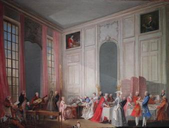 | Keywords: Le Thé à l'anglaise.jpg Artwork Creator Michel-Barthélémy Ollivier 1766 Oil on canvas size cm 53 68 Institution Versailles object history credit line accession number self-photographed Léna PD-old-100 CC-0 Michel-Barthélémy Ollivier 18th-century paintings in the Musée national du Château de Versailles 1766 oil on canvas paintings in France 1760s paintings from France 18th-century paintings of building interiors 18th-century paintings of dogs Candelabras in art Fashion in 1766 Folding screens in art Paintings of paintings Petits théâtres de l'intime Uploaded with UploadWizard Afternoon Tea meal Afternoon in art |