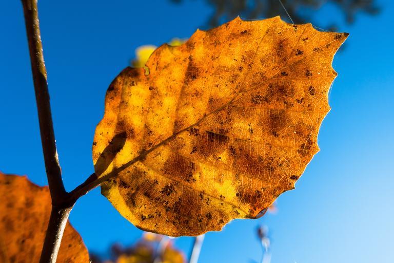 Keywords: leaf beech autumn forest deciduous tree tree nature leaves colorful sun sky blue macro
