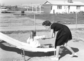 MAKE A MEME View Large Image Leanne Yoder from the Surprise, Arizona Mennonite Voluntary Service Unit on the kindergarten playground. 1966. Citation: Mennonite Board of Missions Photograph Collection. Mission to Surprise, Arizona, 1962-1968. IV-10-7.2 Box 1 Folder 57, ...