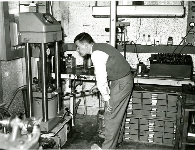 Keywords: LeatherResearch 009.jpg Designed primarily for the study of leather shrinkage this apparatus has been found of value for studying the high-pressure properties of a number of other high polymers Mounted in the press at left is a thick-walled cylindrical steel bomb which contains the polymeric specimen immersed in a pressure-transmitting liquid Pressure is applied to force a tight-fitting piston into the bomb from above This increases the hydrostatic pressure within compressing the specimen Depth of penetration of the piston is determined by reading the dial gage mounted on the ram that drives the piston into the bomb Connections to a manganin pressure gage which is mounted inside the bomb within the pressure-transmitting liquid may be seen near the bottom of the cylinder National Institute of Standards and Technology National Institute of Standards and Technology PD-USGov-NIST PD-USGov National Bureau of Standards National Institute of Standards and Technology Leather Leather shoes