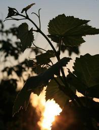 Keywords: leaves lobed vine grape green serrated branch sky sunset