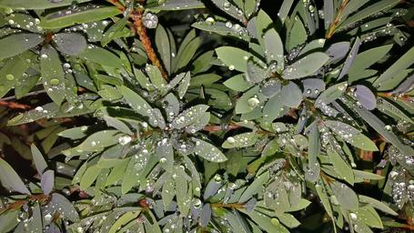 Keywords: leaves shrub green wet water water droplets raindrops dew moisture droplets glistening foliage flora plants botany night close up