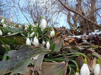Keywords: leaves snowdrops spring sunshine blue sky plants flowers bulbs natural white green blue close-up harbingers of spring
