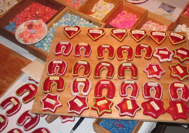 | Keywords: Lect5.JPG Lect manufacture similar to gingerbread in Radovljica Slovenia sweets for decoration - after few days not edible photo Ziga 09 25 26 February 2007 UTC 2007-02-26 own assumed Žiga Cookies Heart-shaped cookies Horseshoe-shaped cookies Star-shaped cookies Red and white icing food Confectionery of Slovenia |