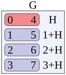 | Keywords: Left cosets of Z 2 in Z 8.svg en Diagram demonstrating cosets Here G is the set <math>\mathbb Z _8</math> the integers mod 8 under addition The subgroup H contains only 0 and 4 and is isomorphic to <math>\mathbb Z _2</math> There are four cosets of H H itself 1+H 2+H 3+H written using additive notation since this is an additive group Together they partition the entire group G into equal-size non-overlapping sets Produced in Inkscape own User Dcoetzee 2013-03-27 Cyclic groups Cc-zero | ||||