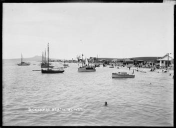 | Keywords: blackandwhite monochrome photo border outdoor boat vehicle black and white View of Bucklands Beach taken on a summer's day from the sea looking towards the beach with Rangitoto Island in the distance. Yachts and launches are anchored close to shore and people are on the beach or walking along the seafront. Hindman's store is on the far right. A man is swimming close to the photographer in the foreground. Photograph taken by William Archer Price in early 1900s. Inscriptions: Inscribed - Photographer's title on negative -bottom left: Bucklands Beach. No 148E. William Archer Price lived and practised in Queen Street, Northcote, 1909-1910. Source: New Zealand Post Office directories Quantity: 1 b&w original negative(s). Physical Description: Dry plate glass negative 4.75 x 6.5 inches Leisure craft and holiday makers at Bucklands Beach, Auckland. Price, William Archer, 1866-1948 :Collection of post card negatives. Ref: 1/2-001285-G. Alexander Turnbull Library, Wellington, New Zealand. natlib.govt.nz/records/22680243 View of Bucklands Beach taken on a summer's day from the sea looking towards the beach with Rangitoto Island in the distance. Yachts and launches are anchored close to shore and people are on the beach or walking along the seafront. Hindman's store is on the far right. A man is swimming close to the photographer in the foreground. Photograph taken by William Archer Price in early 1900s. Inscriptions: Inscribed - Photographer's title on negative -bottom left: Bucklands Beach. No 148E. William Archer Price lived and practised in Queen Street, Northcote, 1909-1910. Source: New Zealand Post Office directories Quantity: 1 b&w original negative(s). Physical Description: Dry plate glass negative 4.75 x 6.5 inches Leisure craft and holiday makers at Bucklands Beach, Auckland. Price, William Archer, 1866-1948 :Collection of post card negatives. Ref: 1/2-001285-G. Alexander Turnbull Library, Wellington, New Zealand. natlib.govt.nz/records/22680243 |