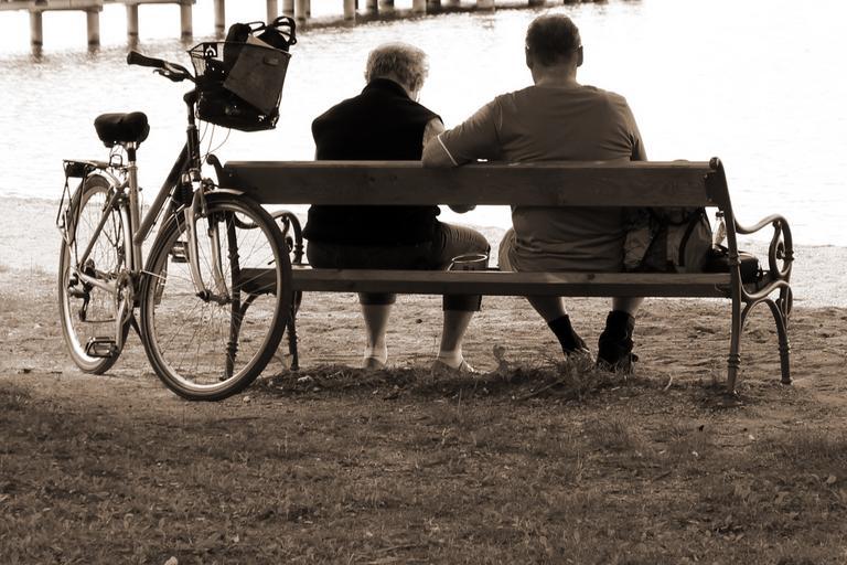 Keywords: leisure recovery personal pair man woman bench bank sit seat rest click out nature relax relaxation bike break