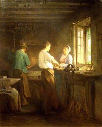| Keywords: Leleux - L atelier du serrurier marechal.jpg by 1869 Oil on canvas Institution Musée Thomas-Henry Cherbourg object history credit line Envoi de l'Etat 1869 accession number Inv MTM 2006 own PD-Art Paintings in the Musée Thomas-Henry Armand Leleux Woodworking in art Workshops in art |