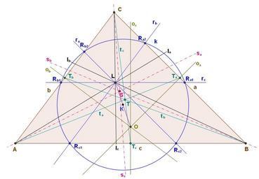 | Keywords: Lemoine Circle.jpg en Lemione circle ΔABC a b c sides t<sub>a</sub> t<sub>b</sub> t<sub>c</sub> medians T<sub>a</sub> T<sub>b</sub> T<sub>c</sub> midpoints T centroid s<sub>a</sub> s<sub>b</sub> s<sub>c</sub> angle bisectors S intersection of the angle bisectors incenter l<sub>a</sub> l<sub>b</sub> l<sub>c</sub> symmedians L intersection of the symmedians Lemoine point o<sub>a</sub> o<sub>b</sub> o<sub>c</sub> perpendicular bisectors O intersection of the perpendicular bisectors circumcenter K center of LO line segment Lemoine circle center k Lemoine circle r<sub>a</sub> r<sub>b</sub> r<sub>c</sub> parallels with sides including Lemoine point R<sub>a1</sub> R<sub>a2</sub> R<sub>b1</sub> R<sub>b2</sub> R<sub>c1</sub> R<sub>c2</sub> intersections of sides and ra rb rc parallels all points lie at Lemoine circle cs Lemoinova kružnice ΔABC a b c strany t<sub>a</sub> t<sub>b</sub> t<sub>c</sub> těžnice T<sub>a</sub> T<sub>b</sub> T<sub>c</sub> paty těžnic T - těžiště s<sub>a</sub> s<sub>b</sub> s<sub>c</sub> osy úhlů S průsečík os úhlů střed kružnice vepsané l<sub>a</sub> l<sub>b</sub> l<sub>c</sub> symediány L průsečík symedián Lemoinův bod o<sub>a</sub> o<sub>b</sub> o<sub>c</sub> - osy stran O průsečík os stran střed kružnice opsané K střed úsečky LO střed Lemoinovy kružnice k Lemoinova kružnice r<sub>a</sub> r<sub>b</sub> r<sub>c</sub> rovnoběžky se stranami vedené Lemoinovým bodem R<sub>a1</sub> R<sub>a2</sub> R<sub>b1</sub> R<sub>b2</sub> R<sub>c1</sub> R<sub>c2</sub> průsečíky stran a rovnoběžek r<sub>a</sub> r<sub>b</sub> r<sub>c</sub> všechny leží na Lemoinově kružnici own Lukas Sova 2009-03-23 math Lemoine circles Centroid Incenter |