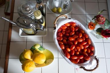 Keywords: lemon olive oil jug tomato eggs tomato basket salt pepper rose kitchen tile white