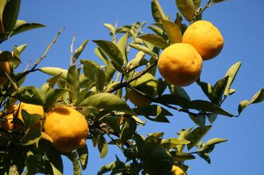 Keywords: lemons fruit citrus rounded fresh yellow branch green leaves fragrant blue sky sunlight