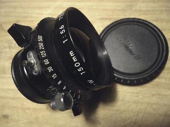 Keywords: nikkor 150 w, a mesma ótica da lente do ampliador, com obturador, feita para 4x5, deve cobrir justo 13x18cm com alguma perda nas bordas