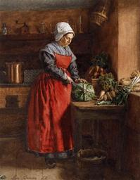 | Keywords: Léon Bonvin - Cook with Red Apron - Walters 371505.jpg In this scene a cook wearing a vermilion apron is chopping a large cabbage Commonplace vegetables are strewn in front of her including turnips leeks celery roots carrots and lettuce The model has been identified as the artist's wife Constance Félicité Gaudon and the location as the family's small tavern in Vaugirard Light from a window at the right penetrates the scene to reveal details in the background including the hanging basket and the shelf with a row of candlesticks a coffee mill and a lantern Placed on the stove is a large glimmering copper pot 1862 watercolor gouache pen and iron gall ink heightened with gum varnish over graphite underdrawing on cream moderately thick moderately textured laid paper cm 20 8 16 2 accession number 37 1505 3154 William T Walters Baltimore December 1 1862 by purchase from the artist with George A Lucas as agent Henry Walters city Baltimore Walters Art Museum Henry Walters Acquired by William T Walters 1862 Signature and date Brown ink lower left Léon Bonvin 62; Number Graphite verso C2 The Essence of Line A Baltimorean in Paris George A Lucas 1860-1909 The Walters Art Gallery Baltimore 1979 The Drawings and Watercolors of Léon Bonvin The Cleveland Museum of Art Cleveland; The Walters Art Gallery Baltimore 1980-1981 A Connoisseur's Portfolio A Vanishing Meadow The Watercolors of Léon Bonvin The Walters Art Gallery Baltimore 1994 Léon Bonvin 1834-1866 Government House Annapolis 1997 place of origin France Walters Art Museum license 2D A Connoisseur's Portfolio The Essence of Line Paintings by Léon Bonvin in the Walters Art Museum Aprons in art |