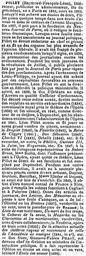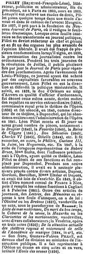 | Keywords: Léon Pillet - Grand dictionnaire Universel du XIXe siècle, vol12 p1015 - Internet Archive.jpg Léon Pillet 1803 “1868 French journalist government official and Director of the Paris Opera from Pierre Larousse's Grand dictionnaire universel du XIXe siècle vol 12 p 1015 <br /> Translation of the text <br /> PILLET Raymond-François-Léon man of letters publicist and administrator son of the preceding Fabien Pillet 1772 “1855 born in Paris in 1803 died in 1868 When he finished his studies in law Pillet spent some time studying to become an attorney and in the office of Mauguin In 1827 he took part in the foundation of the Nouveau Journal de Paris where he was in charge of the theatre column When this literary paper transformed itself into a political journal Pillet became editor-in-chief and manager and made it one of the more advanced organs of liberal opinion He was hit with many condemnations when he signed in 1830 the protest of the journalists against the ordinances During the three days of the July Revolution he published the Journal de Paris several times each day in order to spread the proclamations After the accession of Louis-Philippe this journal having been sold by some capitalists favorable to the new government Léon Pillet took over its direction and defended ministerial policies He followed in 1832 the Duke of Orleans to the Siege of Antwerp at the level of Officer of Ordinance and was decorated that same year becoming maître des requêtes in extraordinary service 1834 Royal Commissioner of the Théâtre de l ™Opéra 1838 and was associated in 1840 as director of this theatre with Duponchel who abandoned the administration of the Opéra entirely to him in 1841 Léon Pillet mounted and produced quite a great number of pieces notably Le drapier 1840 La favorite 1840 La reine de Chypre 1841 Don Sébastien 1843 Charles VI 1843 Othello 1844 etc He revived in addition Le philtre Gustave III La Juive Les Huguenots etc In 1847 in the aftermath of the stormy representation of Robert Bruce Mme Stoltz whose influence predominated at the Opera having quit the theatre Léon Pillet resigned his duties at the theatre and was replaced by Duponchel During his active administration he had suffered several lawsuits brought by various artists Duprez Gardoni Baroilhet Mmes Elssler and Dupont and had been far from enriched In 1849 he was named French Consul to Nice then he served the same functions at Cagliari and Palermo 1861 In addition to many newpaper articles some Lettres some Mémoires in response to a mass of attacks one had from him L ™obstiné ou Les Bretons 1837 vaudeville in one act under the pseudonym of Renaud; the Liste de mes maîtresses Un mari du bon temps the Cabaret de la veuve the Mazurka ou Les clarinettes et les marionnettes vaudevilles with various collaborators; the Vendetta opera iin 3 acts 1830 De la situation actuelle de l ™Académie de musique 1844 in 4 volumes etc “ His brother Gustave-Fabien Pillet became Division Chief at the Ministry of Public Instruction He had a drama in five acts and in verse the École des veuves 1826 presented at the Odéon http //www archive org/stream/LarousGrdictionnXIX12bnf page/n1019/mode/1up Internet Archive Pierre Larousse 1817 “1875 author 1874 publication Léon Pillet PD-old-100 |