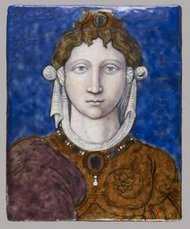 | Keywords: Léonard Limosin - Dido - Walters 44240.jpg Dido is represented as the full-face bust portrait of a woman staring with a vacant expression She wears a gold-brown tiara with a green cabochon translucent green enamel on foil Her dark blonde hair is parted and bound in a white falling veil Her garment consists of a gold-brown cuirass with a necklace of pearls rubies and emeralds and a jeweled pendant featuring a large red stone The jewel-like effect of these ornaments is produced by drops of white and translucent enamels on foils She wears a purple mantle draped over her right shoulder The staring formality and coldness of Dido suggest that as early as 1540 Léonard Limosin may have had knowledge of portraits painted by Agnolo Bronzino It could also reflect Dido's melancholy when Aeneas abondonned her A companion plaque of Dido's lover Aeneas the founder of Rome also belongs to the Walters collection Walters 44 239 ca 1540 Renaissance technique painted enamel copper cm 30 3 24 8 accession number 44 240 28312 Castle of Gaillon George Robinson Harding London date and mode of acquisition unknown William T / Henry Walters Collection Baltimore date and mode of acquisition unknown Walters Art Museum Henry Walters Acquired by William T or Henry Walters World of Wonder The Walters Art Gallery Baltimore 1971-1972 Carthage l'histoire sa trace et son écho Musée du Petit Palais Genève 1995 place of origin Limoges France Walters Art Museum license Limoges painted enamels in the Walters Art Museum Léonard Limosin Painted enamel art in the Walters Art Museum Dido Front view portrait paintings of females |