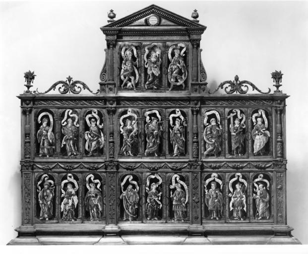 | Keywords: Léonard Limosin - Twenty-one Plaques Depicting Prophets, Apostles and Sibyls - Walters 44366.jpg The idea of juxtaposing the prophets with the Apostles stems from the medieval passion for showing how the events and figures of the Old Testament prefigure those of the New Testament The sibyls were ancient prophets who though known to the artists of the Middle Ages were not frequently represented until the Italian humanist Filippo Barbieri published a treatise in 1481 in which he attributed to each sibyl a certain age appearance attribute and particular prophecy which corresponded to that of an Old Testament prophet These twenty-one plaques which were arbitrarily set in the present frame in the 19th century were probably once arranged according to a strict scheme which contrasted the revelation to the sibyls of the pagan world with the revelation of the Law in the Old Testament and its fulfillment in the New Testament The figures identified by their fluttering scrolls are dressed in fantastic robes which may in part reflect the costumes of actors in the mystery plays The Cimmerian Sibyl holds a horn of plenty which refers to the prophecy of Joel that the Lord would relieve the suffering of His people and to the golden age promised in the Fourth Eclogue of Vergil In the center is the Old Testament prophet David the forefather of Jesus who is playing his harp He is flanked by the Phrygian Sibyl who holds the cross-staff with a pennant the symbol of the resurrection of Christ ca 1535 1540 late Renaissance painted enamel plaques in gilt screen Each plaque cm 23 10 5 approx accession number 44 366 9655 Beurdeley Sale April 9 1883 no 98 H G Marquand Sale New York Janaury 23 1903 no 1061 Henry Walters city Baltimore Walters Art Museum Henry Walters Acquired by Henry Walters 1903 place of origin Limoges France Walters Art Museum license Limoges painted enamels in the Walters Art Museum Léonard Limosin Media contributed by the Walters Art Museum needs category review Painted enamel art in the Walters Art Museum |