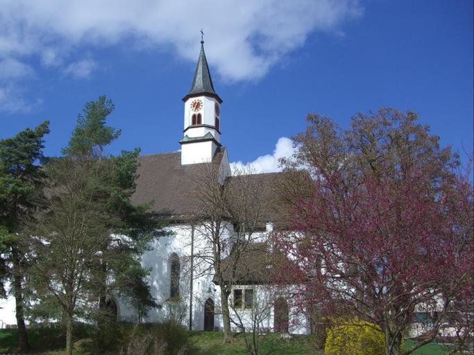 Keywords: leonhard church church leonhard langenau building architecture steeple spring sky blue clouds