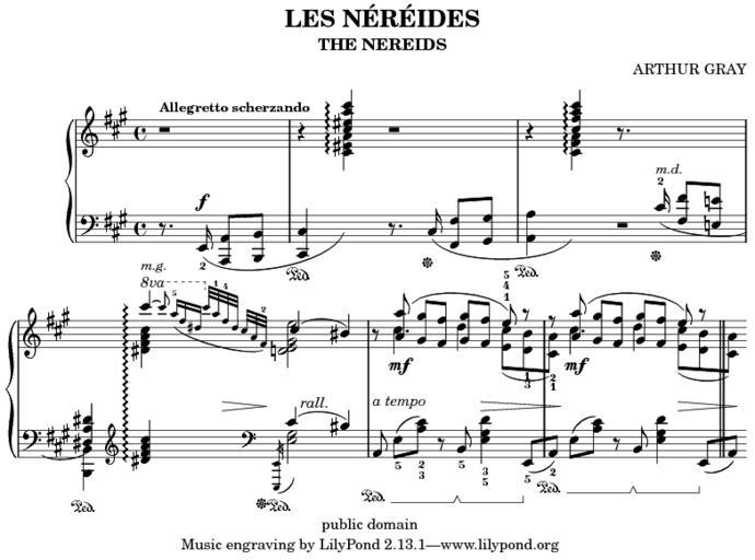 Keywords: Les-nereides.png en Public Domain sample file for the LilyPond Music engraving software project and web page Music by Arthur Gray es Archivo de muestra en el Dominio Público para el programa de edición musical LilyPond y su página web La música es de Arthur Gray The LilyPond project http //lilypond org/doc/v2 12/examples Music by Arthur Gray Engraving by LilyPond Software Image slightly adapted by me Put into the LilyPond project by Han-Wen Nienhuys Thu Oct 5 09 36 48 2000 See original source LilyPond source <syntaxhighlight lang latex > \version 2 12 0 \header composer ARTHUR GRAY title LES NÉRÉIDES subtitle THE NEREIDS enteredby JCN piece Allegretto scherzando copyright public domain Nastiest piece of competition at http //www orphee com/comparison/study html see http //www orphee com/comparison/gray pdf Lines that contain tweaks 10 currently not counting reverts are marked with tweak possibly more impressive to render without tweaks grep -v tweak input/les-nereides ly >> lnnt ly lilypond lnnt ly treble \new Voice \relative c \key a \major r2 2 \stemUp r4 <cis eis a cis>\arpeggio r2 3 r4 <cis fis a cis>\arpeggio r8 \change Staff bass cis 16 2 \markup \small \italic m d \sustainOff <fis fis >8 <e e > 4 <dis a' dis>4 \sustainOn \change Staff treble \slurUp \set PianoStaff connectArpeggios t \ottava 1 \tieUp cis'4 \markup \small \italic m g \arpeggio~ \grace cis8 \revert Stem 'direction a16-5_ fis dis \ottava 0 cis32 a-1 fis-4 dis cis a fis -2 the small grace in lower staff comes after us s32 \stemUp cis'4 bis 5 r8 <a' a >8 \mf <gis gis > <fis fis > \fingerUp \override Fingering 'direction UP <gis gis > <fis fis > e -1-4-5 r 6 r <a a >8 \mf <gis gis > <fis fis > <gis gis > <fis fis > e r 7 \bar trebleTwo \new Voice \relative c \stemDown \slurDown \fingerDown \override Fingering 'direction DOWN s2 1 s1 2 4 s4 <cis' a fis dis>4\arpeggio <e gis e d >2 5 s8 cis4 d4 fair to count as one tweak \override Fingering 'add-stem-support t tweak \override Fingering 'padding 0 15 \override Fingering 'slur-padding 0 1 <cis e >8 <d _3 b'_1> 6 <cis_1 a'_2> cis'4 d4 <cis e >8 <b d > 7 <a cis > bass \new Voice \relative c \partial 2 \key a \major \slurDown \dynamicUp r8 e 16 \f_2 <a a >8 <b b > 2 \override Staff SustainPedalLineSpanner 'staff-padding 5 tweak <cis cis >4\sustainOn \change Staff treble \stemDown <a eis cis>4 \arpeggio \change Staff bass \stemNeutral r8 cis 16 \sustainOff <fis fis >8 <gis gis > 3 <a a >4\sustainOn \change Staff treble \stemNeutral \stemDown <a' fis cis> \arpeggio \change Staff bass \stemNeutral r2 4 \stemDown <b b >4 \clef treble \stemNeutral << urg staff-change on dis <cis a fis dis >\arpeggio >> \grace \override Stem 'stroke-style grace s8 s16 s s s32 s s s s s \clef bass <e e >32 \sustainOff\sustainOn \revert Stem 'stroke-style <gis' e>2 5 \slurUp \fingerDown \override Fingering 'direction DOWN \override Staff SustainPedalLineSpanner 'staff-padding 3 5 tweak \set Staff pedalSustainStyle 'mixed a 8 e'-5 <a-2 cis-3> a 8\sustainOn e'-5 <a cis> -2-3 r b -5 <e-3 gis-5 d'>4 r b -5\sustainOff\sustainOn <e gis d'>4-3-5 \slurNeutral e 8-5 \sustainOff 6 a -2\sustainOn \slurUp e' <a cis> r b \sustainOff\sustainOn <e gis d'>4 \slurNeutral e 8 \sustainOff 7 a bassTwo \new Voice \relative c \skip 2 \skip 1 2 \skip 2 \stemUp \slurUp cis'4 bis middleDynamics \override Dynamics TextScript 'padding -1 tweak s2 s1 2 4 s2 \grace s8 s16 s s s32 s s\> s s32 s s\ s \textLengthOn s32 s- rall s s s8 s4 \textLengthOff 5 s2- a tempo s8 s \> s s 6 s8\ s2 s8 s\> s 7 s8\ theScore \score \context PianoStaff << \new Staff treble << \treble \trebleTwo >> \new Dynamics << \middleDynamics >> \new Staff bass << \clef bass \bass \bassTwo >> >> \layout \context \Score pedalSustainStrings ' Ped Ped \remove Bar_number_engraver \context \type Engraver_group \name Dynamics \consists Output_property_engraver \override VerticalAxisGroup 'minimum-Y-extent ' 0 0 \consists Script_engraver \consists Dynamic_engraver \consists Text_engraver \override TextScript 'font-size 1 \override TextScript 'font-shape 'italic \consists Skip_event_swallow_translator \consists Axis_group_engraver \context \PianoStaff \accepts Dynamics \book \score \theScore Local variables coding utf-8 LilyPond-indent-level 2 End </syntaxhighlight> musical notation Images with LilyPond source code Sheet music for piano |