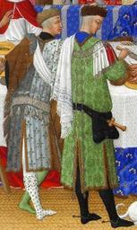 | Keywords: Les Très Riches Heures du duc de Berry Janvier cropped.jpg Artwork Creator Limbourg Brothers Très Riches Heures du Duc de Berry fr Le duc de Berry assis en bas à droite dos au feu est habillé de bleu et coiffé d'un bonnet de fourrure Il invite ses gens et ses proches à se présenter à lui Derrière lui figure l'inscription « Approche Approche » Plusieurs familiers du duc s'approchent de lui pendant que des serviteurs s'affairent les échansons servent à boire deux écuyers tranchants au centre sont vus de dos ; au bout de la table officie un panetier Au-dessus de la cheminée figurent les armes du duc « d'azur semé de fleurs de lys d'or à la bordure engrêlée de gueules » avec de petits ours et des cygnes blessés Plusieurs animaux de compagnie sont représentés petits chiens sur la table lévrier au sol La tapisserie du fond de la salle semble représenter des épisodes de la guerre de Troie Stundenbuch des Herzogs von Berry langswitch Szene Monatsbild Januar Scene january scène mois de Janvier représentation des frères Limbourg between 1412 1416 Tempera vellum size cm 22 5 13 6 Institution Musée Condé accession number Ms 65 f 1v object history credit line de Buchmalerei franko-flämische Malerei um 1400 Raymond Cazelles et Johannes Rathofer préf Umberto Eco Les Très Riches Heures du Duc de Berry Tournai La Renaissance du Livre 2001 1re éd 1988 238 p ISBN 2-8046-0582-5 p 14<br>http //www wga hu/html/l/limbourg/01janvif html Web Gallery of Art R-G Ojéda/RMN File 006 MS 65 F1 V jpg crop User Il Dottore Les_Très_Riches_Heures_du_duc_de_Berry_Janvier jpg Original upload log This image is a derivative work of the following images File Les_Très_Riches_Heures_du_duc_de_Berry_Janvier jpg licensed with PD-Art 2005-04-14T04 07 13Z Petrusbarbygere 1333x2062 560295 Bytes <nowiki>Les Très Riches Heures du duc de Berry Janvier the Musée Condé Chantilly PD-old-100 Très Riches Heures du Duc de Berry</nowiki> Uploaded with derivativeFX PD-old-100-1923 DEFAULTSORT Limbourg Brothers Tres Riches Heures du Duc de Berry 01 January2 1 Labors of the months in Tres Riches Heures du Duc de Berry 01january2 1 Bowl cut Mi-Parti Hose clothing 15th-century fashion 1414 circa |