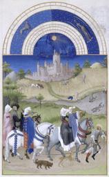 | Keywords: Les Très Riches Heures du duc de Berry aout.jpg Artwork Creator Limbourg Brothers Très Riches Heures du Duc de Berry Au premier plan figure une scène de fauconnerie le cortège à cheval part pour la chasse précédé d'un fauconnier Celui-ci tient dans la main droite le long bâton qui lui permettra de battre arbres et buissons pour faire s'envoler le gibier Il porte deux oiseaux au poing et à la ceinture un leurre en forme d'oiseau que l'on garnissait de viande pour inciter les faucons à revenir Le cortège est accompagné de chiens destinés à lever le gibier ou à rapporter celui qui aura été abattu Sur leur cheval trois personnages portent un oiseau sans doute un épervier ou un faucon émerillon Au second plan sont représentés les travaux agricoles du mois d'août Un paysan fauche le champ un deuxième réunit les épis en gerbes alors qu'un troisième les charge sur une charrette tirée par deux chevaux à proximité d'autres personnages se baignent dans une rivière ” peut-être la Juine ” ou se sèchent au soleil à l'arrière-plan se dresse le château d'Étampes que le duc de Berry avait acquis en 1400 à la mort de Louis d'Évreux comte d'Étampes Derrière les remparts on distingue le donjon quadrangulaire et la tour Guinette qui existe toujours between 1412 1416 painting vellum size cm 22 5 13 6 Institution Musée Condé accession number Ms 65 f 8v object history credit line Raymond Cazelles et Johannes Rathofer préf Umberto Eco Les Très Riches Heures du Duc de Berry Tournai La Renaissance du Livre 2001 1re éd 1988 238 p ISBN 2-8046-0582-5 p 42 R M N / R -G Ojéda http //www chateaudechantilly com/groupes-et-professionnels/groupes-enfants/ressources-pédagogiques/les-chefs-d ™Å“uvre-à -la-loupe/les-très-ric chateaudechantilly com PD-old-100 August in art Labors of the months in Tres Riches Heures du Duc de Berry Medieval miniatures of castles 1410s fashion Château d'Étampes Medieval miniatures of horse riding 1410s Gaited horse |