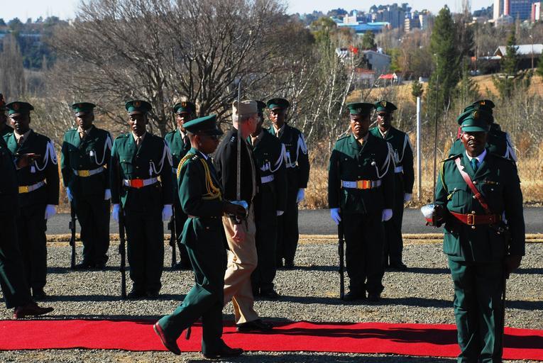 Keywords: Lesotho Defense Force 2009.jpg Major General Samuel Mokoro deputy commander of Lesotho Defence Force walks alongside Vice Admiral Robert Moeller U S Africa Command's deputy to the commander for military operations as they inspect the soldiers of 1st Battalion of the Lesotho Defense Force on August 4 2009 http //www africom mil/file asp HR 2 ID 20090805154005 2009-08-04 Photo by Petty Officer 1st Class Daniel P Lapierre U S Africa Command PD-USGov-Military-Navy Military of Lesotho Robert T Moeller Inspections of troops Photographs by Daniel Lapierre |