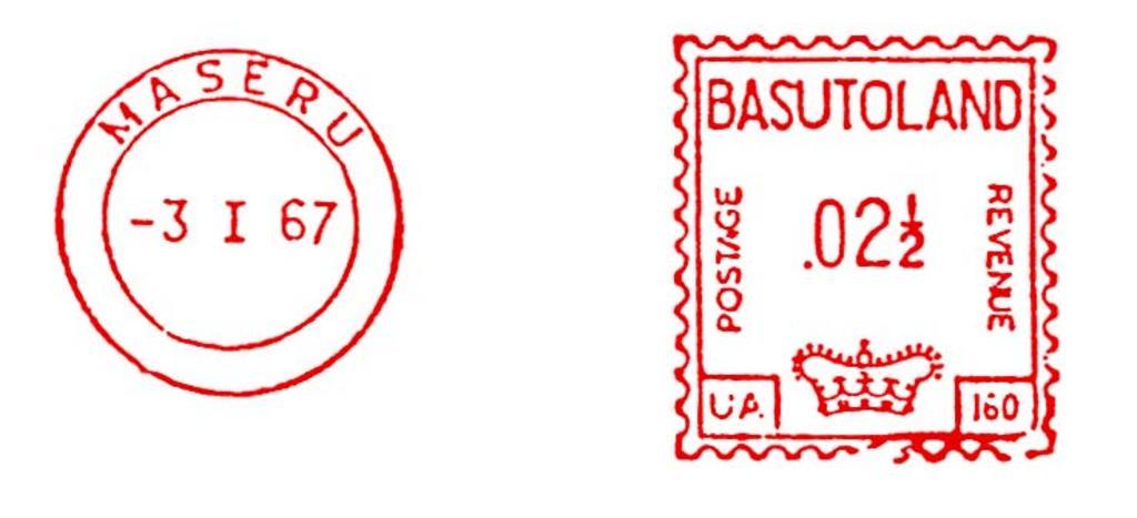 Keywords: Lesotho stamp type A2.jpg en Meter stamp catalog image Lesotho type A2 Richard Stambaugh Richard Stambaugh 2011-11-13 Meter stamps of Lesotho