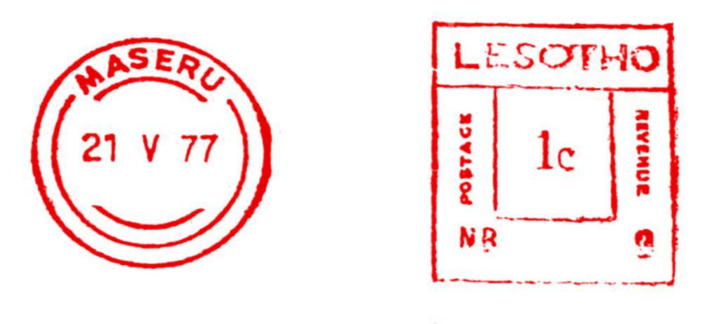 Keywords: Lesotho stamp type BC1.jpg en Meter stamp catalog image Lesotho type BC1 Richard Stambaugh Richard Stambaugh 2011-11-15 Meter stamps of Lesotho