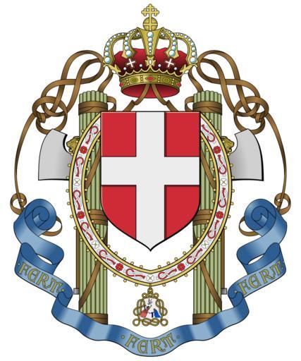 | Keywords: Lesser coat of arms of the Kingdom of Italy (1929-1943).svg piccolo stemma del Regno d'Italia durante il fascismo <br/>Lo stemma era impresso anche sulle derive della Regia Aeronautica dal 1930 sino alla fine del regime fascista coat of arms of the Kingdom of Italy during the fascism <br/>The coat of arms was used also on the tail of the Royal Italian Air Force Regia Aeronautica from 1930 until the end of the fascist regime inkscape <div style border 1px solid aaaaaa; padding 5px; font-size 90 ; class box> <center>Regio decreto nº 504<br />11 aprile 1929</center> <center>Articolo 1</center> Il grande stemma dello Stato è formato dello scudo di Savoia di rosso alla croce di argento sormontato da un elmo reale d'oro completamente aperto damascato foderato di rosso e posto in maestà ornato di un cercine e di svolazzi d'oro e di azzurro cimato con la corona di ferro Sostegni due fasci littori addossati con l'ascia all'infuori legati con strisce di cuoio intrecciate e formanti due nodi di Savoia Lo scudo fregiato con la grande collana dell'ordine supremo della SS Annunziata con le grandi fasce delle grandi croci degli ordini reali del SS Maurizio e Lazzaro militare di Savoia e della Corona d'Italia e con nastro e croce del merito civile di Savoia; la grande fascia dell'ordine Mauriziano annodata da quattro cifre reali d'oro e caricata del motto «Fert» tre volte ripetuto Il tutto posto sotto un padiglione di porpora bardato d'un gallone e frangiato d'oro soppannato d'ermellino col colmo di tela di argento ricamato a lingue di guoco d'oro moventi dal lembo superiore e a fiamme alternate d'oro e di rosso nella parte inferiore con un drappellone intagliato a forma di vaii di velluto azzurro gallonato e con fiocchi d'oro; questo padiglione cimato della corona reale <center>Articolo 2</center> Il piccolo stemma dello Stato è formato di uno scudo di rosso alla croce di argento cimato da corona reale dalla quale escono lateralmente due nastri al nodo di Savoia; il tutto accollato al collare dell'ordine della SS Annunziata e sostenuto da due fasci littori con l'ascia all'esterno al naturale Il tutto accompagnato in punta da una lista accartocciata con il motto «Fert» in oro ripetuto tre volte <center>Articolo 3</center> Le varie foggie di questi stemmi sono effigiate nelle tavole unite al presente decreto le quali saranno firmate d'ordine nostro dal capo del governo primo Ministro segretario di Stato La corona reale è quella prescitta dagli artt 43 e 45 del regio decreto 1º gennaio 1890 sopra i titoli e stemmi della famiglia reale </div> http //www giacomocaruso it/mc202/immagine 20087 jpg immagine 20087 jpg http //www hist uib no/antikk/redigerte-stamp/r244 jpg A stamp http //www hi is/~maurizio/trasvolata/savoia gif A picture Massimo Civoli Aeroplani 1923 - 2003 Gribaudo editore ISBN 88-8058-299-2 a cura di Roberto Gervaso parlami d'amore Mariù Vita costume e storia d'Italia tra gli anni venti e quaranta Rizzoli A photo taken at Vigna di Valle Museum a museum of the Italian Air Force http //www aereomodellistiagello it/images/agello/stemma jpg 2007-07-13 F l a n k e r F l a n k e r SVG coats of arms of Italy Military symbols of Italian fascism Military coats of arms of the Italian Air Force Cords in heraldry Knots in heraldry Coats of arms of Kingdom of Italy Roundels of Italy Order of the Most Holy Annunciation in heraldry Fasces in supporters Crowns in crest Gules a cross argent FERT |