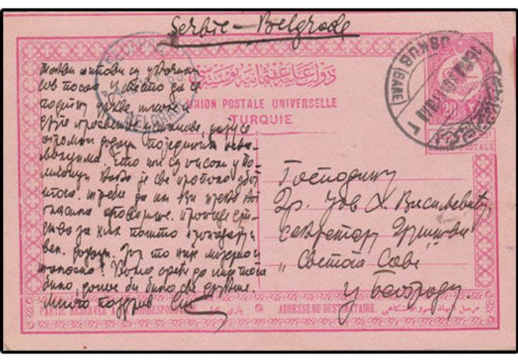 Keywords: Letter from Skopje to the Saint Sava society, 1910.jpg Serbian letter from Skopje http //postcardcircuit com/sites/default/files/sfk-auctions/stampauction/public-auction-38/2712 jpg 1910 author PD-Ottoman Empire PD-1923 Serbian Chetnik Organization 1903-1918 Letters written messages Postal stationery Post of the Ottoman Empire |