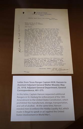 | Keywords: Letter from Texas Ranger Captain W. M. Hanson re the 18th Amendment, May 25, 1918 - Lorenzo de Zavala State Archives and Library Building - Austin, Texas - DSC08355.jpg en Exhibit in the Lorenzo de Zavala State Archives and Library Building - Austin Texas USA 2015-11-17 16 03 49 own Daderot other versions cc-zero Collections of the Lorenzo de Zavala State Archives Alcohol prohibition in the United States | ||||