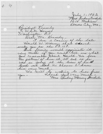 Keywords: Letter on PT 109 Crew Information July 7, 1962 - NARA - 193761.tif Scope and content Letter from writer seeking information about Harold W Marney who served with John F Kennedy aboard PT 109 General notes 193761 Local identifier President 1961-1963 Kennedy Office of the Personal Secretary 1961 - 1963 John F Kennedy Library NLJFK Columbia Point Boston MA 02125-3398 1962-07-01 Record group Collection JFK-POF Papers of John F Kennedy President's Office Files 01/20/1961 - 11/22/1963 Record group ARC 1166 Papers of President Kennedy President's Office Files Personal Secretary's Files compiled 01/20/1961 - 11/22/1963 Series ARC 193725 File unit John F Kennedy President's Office Files Personal Secretary's Files PT 109 - Correspondence - General 1943 - 1962 File unit ARC 193756 Variant control numbers NAIL Control Number NLK-POF-PSFILES-PT109CORRESGEN-LTRREPT109CREW yes Other versions NARA-cooperation PD-USGov Documents in English |