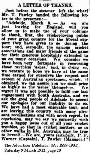 Keywords: Letter of thanks 1912 Ashes.jpg from the http //www nla gov au/ndp/ National Library Australian newspapers digitisation program which are pre-1955 so no copyright The service includes newspapers published in each state and territory from the 1800s to the mid-1950s when copyright applies http //www nla gov au/ndp/ National Library Australian newspapers digitisation program 1912-03-09 The Advertiser PD-Australia National Library of Australia - Australian Newspapers Service Newspaper clippings about cricket |