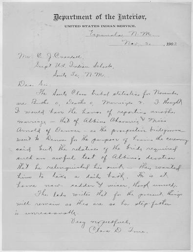 | Keywords: Letter to Superintendent reporting the statistics for the month of November. - NARA - 293246.tif Scope and content Letter to Supt Crandall from Miss True reporting the statistics for the Santa Clara Pueblo for the month of November She stated that there were 2 marriages and there would have been another one but the relatives of the bride who lived in Denver demanded that the prospective bridegroom from the Pueblo bathe daily The Indian relinquished his suit because he thought that was unreasonable General notes 293246 Local identifier Department of the Interior Bureau of Indian Affairs Santa Fe Indian School Santa Clara Day School - NARA-Author True Clara D Author 8467825 <br /> New Mexico United States North and Central America state 4191641 35 -105 <br /> NARA's Rocky Mountain Region Denver NRGA Building 48 Denver Federal Center West 6th Avenue and Kipling Street Denver CO 80225-0307 1903-11-30 Record group Record Group 75 Records of the Bureau of Indian Affairs 1793 - 1999 Record group ARC 404 Letters Received from Day School Teacher Clara D True compiled 08/29/1902 - 09/17/1906 Series ARC 293139 File unit File unit ARC Variant control numbers NAIL Control Number NRG-75-E38-C19031130B yes Other versions NARA-cooperation PD-USGov United States Department of the Interior |