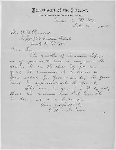 Keywords: Letter to Superintendent requesting permission for one of the students of the Santa Fe Indian School to come home to... - NARA - 293262.tif Scope and content Letter to Supt Crandall from Miss True requesting that Domasio Tafoya be permitted to leave the Santa Fe Indian School and come home to the Santa Clara Pueblo to visit his very sick mother General notes 293262 Local identifier Department of the Interior Bureau of Indian Affairs Santa Fe Indian School Santa Clara Day School - NARA-Author True Clara D Author 8467825 <br /> New Mexico United States North and Central America state 4191641 35 -105 <br /> NARA's Rocky Mountain Region Denver NRGA Building 48 Denver Federal Center West 6th Avenue and Kipling Street Denver CO 80225-0307 1904-02-04 Record group Record Group 75 Records of the Bureau of Indian Affairs 1793 - 1999 Record group ARC 404 Letters Received from Day School Teacher Clara D True compiled 08/29/1902 - 09/17/1906 Series ARC 293139 File unit File unit ARC Variant control numbers NAIL Control Number NRG-75-E38-D19040204B yes Other versions NARA-cooperation PD-USGov Native American schools ~ 1904 in New Mexico NARA images of New Mexico ~ |