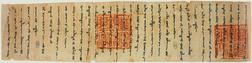 | Keywords: LetterArghunToNicholasIV1290VaticanArchives.jpg Arghun Khan of the Mongol Ilkhanate to Pope Nicholas IV 1290 Ink on paper Original size 84 cm x 97 cm Archivio Segreto Vaticano The letter is in the Mongolian language in handwritten Mongolian script the seals are in Chinese French translation in Mostaert/Cleaves Trois documents mongols des Archives secrètes vaticanes in Harvard Journal of Asiatic Studies 15 1952 Transliteration busad alivaa irgen ooriin nom bichgeer zalbirahun aran hudalchihan zalbiran bui Misiha-giin nom tengert taigch unen bui Edugee Il Khan Misiha-giin nomd ortugai hemeej ilgeejee chi Sain etseg mani Misiha-giin nom unen tul sain emegiig ba shilamtai hu bulgee hemeen ta hiristan irgend ad buu hurtugei hemeen hedentee ba duulgan elchin ilgeegeed oguuleech hu ilgeen avai ze Shilamd ortugai hemeehui chin zov Ba Chinggis Khaany urguud ooriin Mongoljin toroor aj shilamd orvoos ba esvees beer gagts Monh Tenger med hemeej Ed shilamd orogsod tani metes magad unen setgelten ariun aran Monh Tengeriin Misiha-giin nom zarlig bus ul bolgon bui za Busad irgen Monh Tengeriig umartaj bus bolgoj hudal hulgai uildehun uleg olon bui Edugee namaig shilamd es orjee hemeen muulj ba setgej ah chi Gagts Monh Tengert zalbirvaas zugeer setgej avaas shilamd orson met uleg bui Bichig mani bars jil zuny terguun saryn tavan shineded Urumi-d buhui dor bichvei Translation previous words in manuscript are damaged you have sent a message saying 'The other peoples of the universe whoever they are being people who pray according to their own religion and scriptures Buddhists Muslims etc are praying falsely The religion of Misiqa Messiah the Christ adores Heaven and is true May the Ilkhan now adopt the religion of Misiqa ' Saying that our good father - because the religion of Misiqa is the right one - as well as our good grandmother had also received silam baptism -Syrian loanword you have also again and again made communications sent ambassadors and bearers of urgent oral messages who said 'May nothing bad be committed against the Christians ' Your saying 'May the Ilkhan receive silam' is legitimate We say 'We the descendants of Genghis Khan keeping our own proper Mongol identity whether some receive silam or some don't that is only for Eternal Tengri Heaven to know decide ' People who have received silam and who like you have a truly honest heart and are pure do not act against the religion and orders of the Eternal Tengri and of Misiqa Regarding the other peoples those who forgetting the Eternal Tengri and disobeying it are lying and stealing are there not many of them Now you say that we have not received silam you are offended and harbor thoughts of discontent But if one prays to Eternal Tengri and carries righteous thoughts it is as much as if he had received silam We have written our letter in the year of the tiger the fifth of the new moon of the first summer month May 14th 1290 when we were in Urumi Red seal imprints with the same six seal script Chinese characters 輔 安民之寶 Fǔguó ānmín zhībǎo Precious seal of the upholder of the State and the purveyor of peace to the People Original document preserved in the Vatican Archive http //asv vatican va/en/arch/mongolian htm <br> Scanned by User Yaan from Dschingis Khan und seine Erben exhibition catalogue München 2005 p 280 the catalog incorrectly describes the document as a letter from Ghazan to Boniface VIII 1290 Unknown scribe on order of Arghun PD-old-100 Nicolaus IV Arghun Documents in Mongolian Documents of the Ilkhanate Chinese seal art |