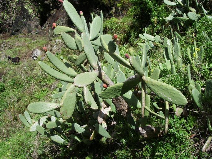Keywords: Lev.N.doNorte 193.jpg en Levada Nova do Norte Opuntiae prickly pears ; black goat Goats eat these prickly plants pt Tabaibeira de Opuntien an der Levada; schwarze Ziege own own walk Levada Nova do Norte Goats Opuntia maxima